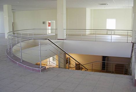 Перила из нержавейки и заполнением из стекла в кинотеатре. Фото 1.